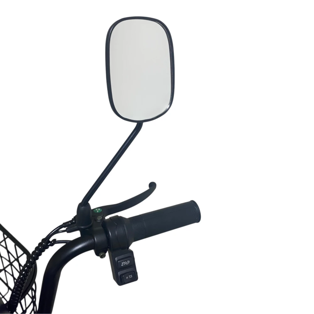 • Отличия от классических эл‑самокатов: полноценная рама, два сиденья, корзина, спинки и зеркала – это как гибрид городского электровелосипеда и компактного электроскутера.